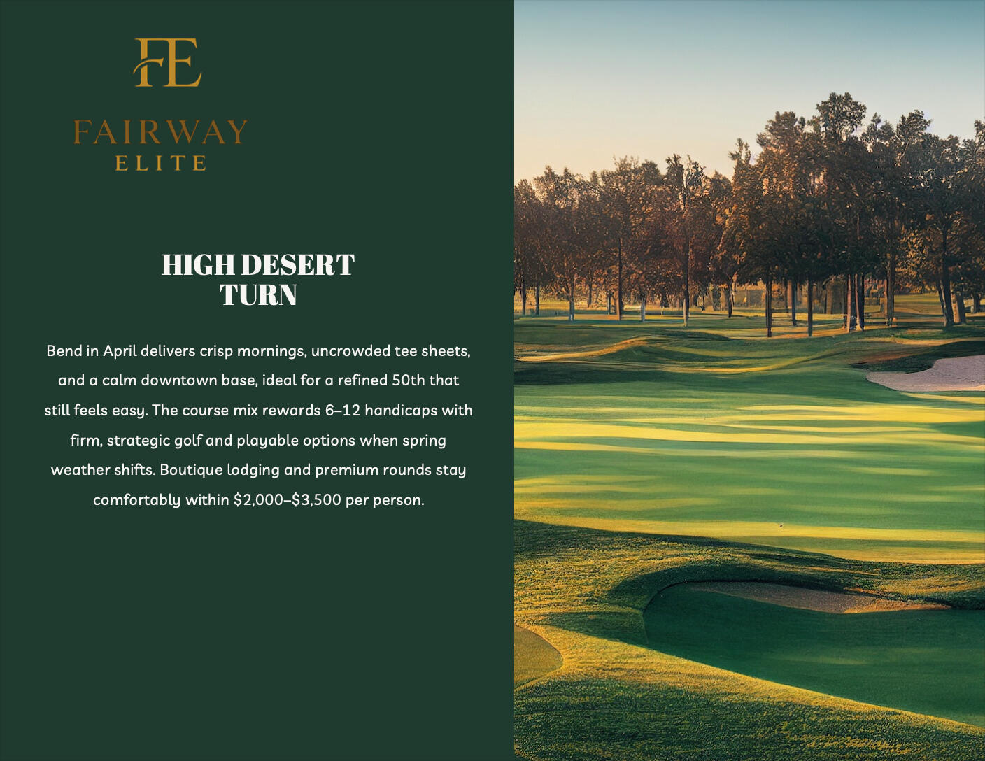 Fairway Elite designs structured, decision-ready golf itineraries for groups who value exceptional courses, thoughtful pacing, and efficient planning.Each itinerary is tailored to your group’s skill level, budget, schedule, and logistics, then delivered in a clear format your group can review and act on immediately.